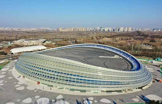 國家速滑館是北京2022年冬奧會北京賽區(qū)新建的標(biāo)志性場館,位于奧林匹克森林公園南園西北側(cè),北鄰國家網(wǎng)球中心,東臨奧林西路、西臨林萃路。速滑館屋面外緣設(shè)有建筑一體化的太陽能光伏電力系統(tǒng),藍色的單元電池板自屋頂外邊緣向內(nèi)側(cè)漸變排列,如同正在融化的雪,展現(xiàn)冬季運動的特色。